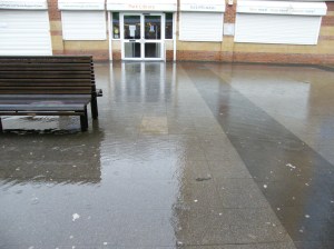 On the basis of soundings from the local community it was intended that the scheme would include a roof over the square, enabling it to be locked up at night. Because of this plan the developers did not bother to put in any drainage in the main body of the square. The paving stones were laid on sand. However, since the roof was never constructed, and the absence of drainage, the Square is prone to flooding when there is heavy rain. A lake sneaks its way towards the entrance to the Library (see the picture above).